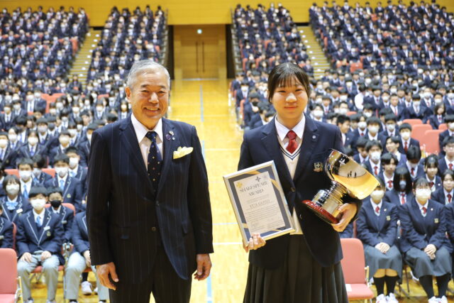 後藤さんは水泳部に所属し、本年度は全国高校総体(インターハイ)女子100mバタフライ優勝、第48回全国JOCジュニアオリンピック夏季水泳競技大会女子100mバタフライ優勝などの輝かしい成績を収め、本校の校訓である文武両道を実践しました。