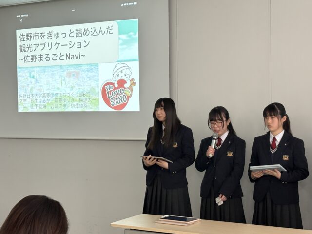 B班の発表のタイトル「佐野氏をぎゅっと詰め込んだ観光アプリケーション~佐野まるごとNavi~」