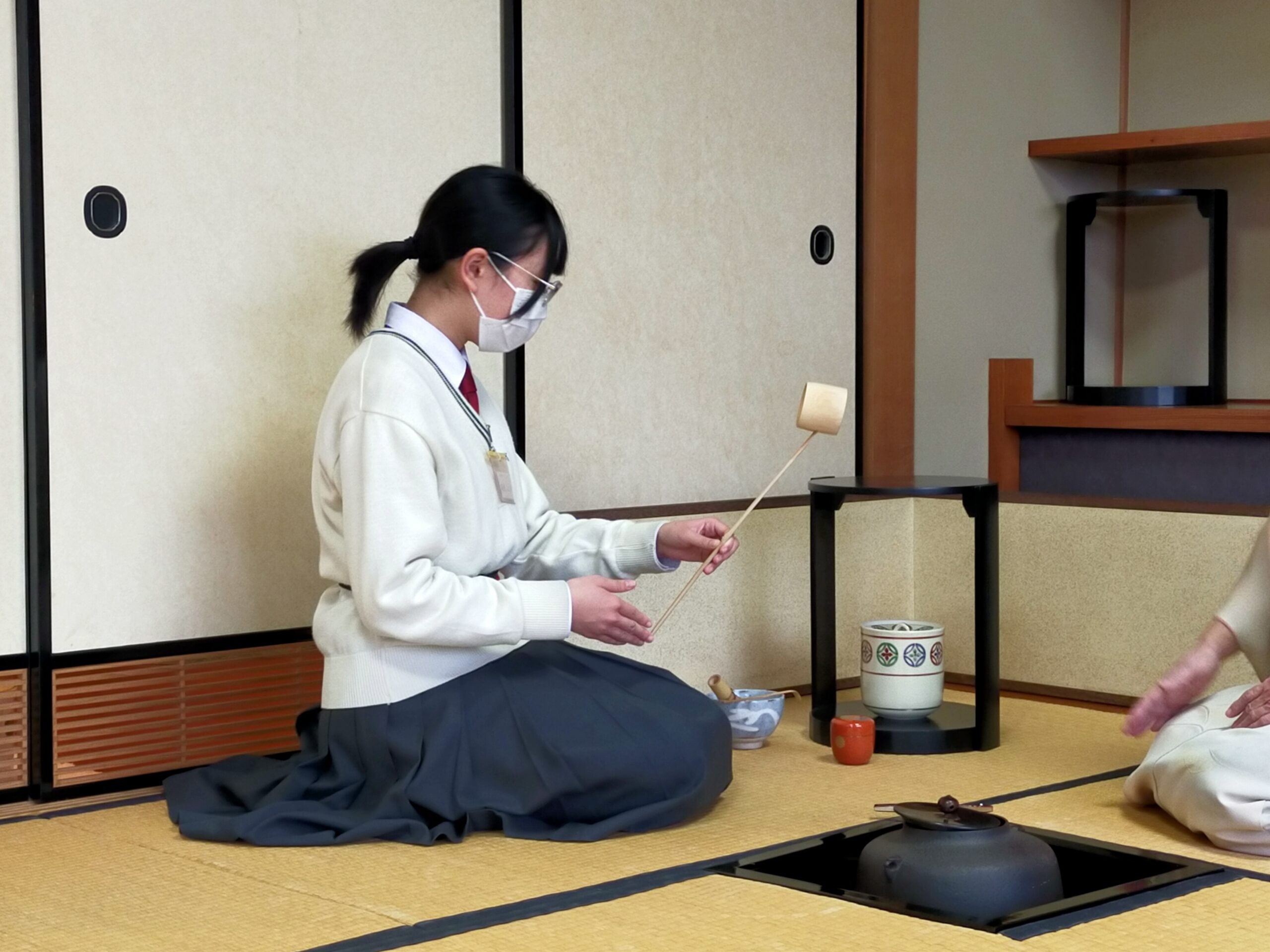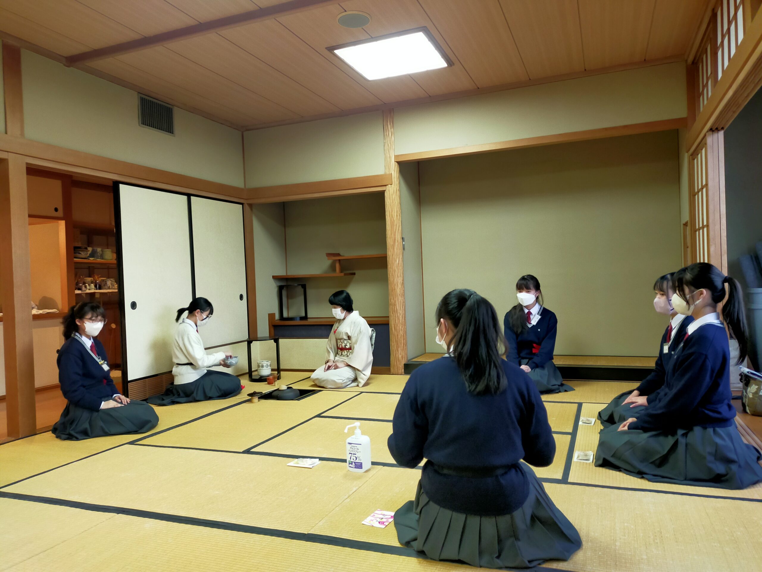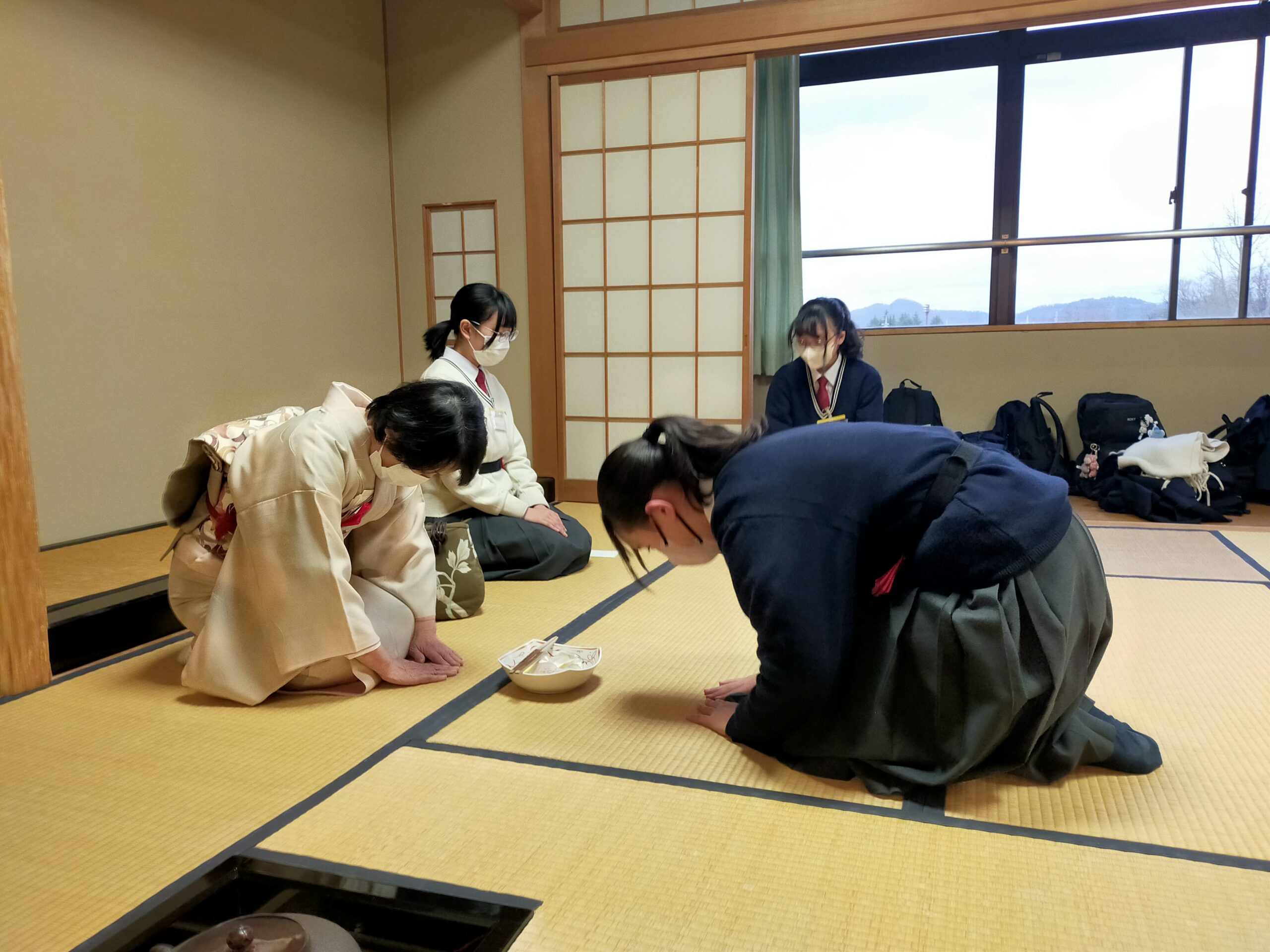 2023年01月17日(火曜日) 【茶道部】初釜 新年最初のお稽古「初釜」が行われました。 お菓子は「花びら餅」です。 ごぼうと味噌が入ったお菓子です。これは平安の時代の「歯固めの儀式」(長寿を願って猪、大根、押鮎などを食べる儀式)を簡略化したもので、ごぼうは押鮎を表し、餅と味噌餡には雑煮の意味が込められています。 本年も感染対策をしながらお稽古に励みましょう。