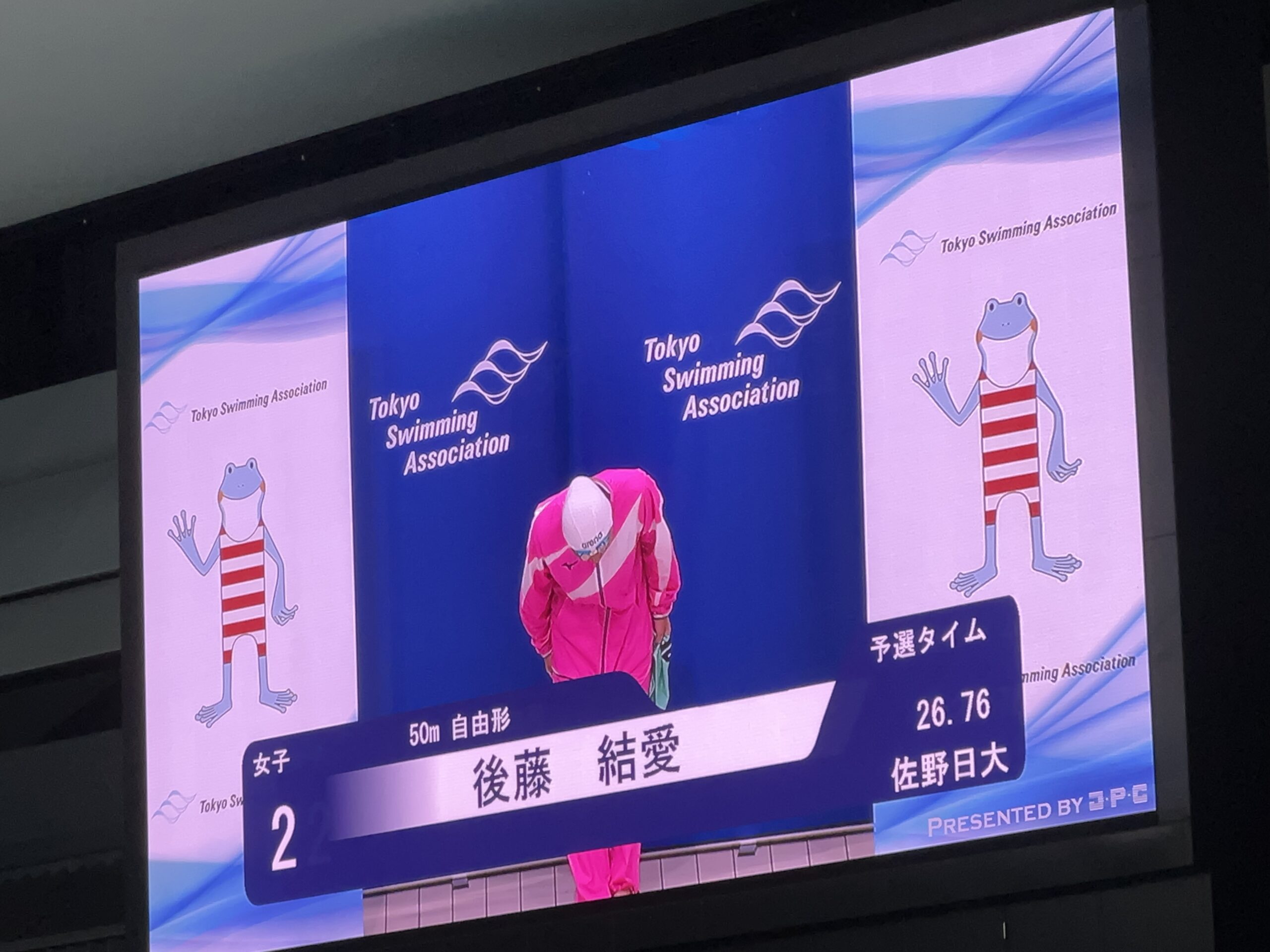 上は女子100mバタフライにおける、後藤さんの力泳です。結果は予選12位でしたのでファイナル進出とはなりませんでした。お疲れさまでした。後藤さんは上記女子50m自由形、女子100mバタフライの2種目で全国大会標準突破し、8月17日(木)から北海道での全国大会に出場することになりました。おめでとうございました。