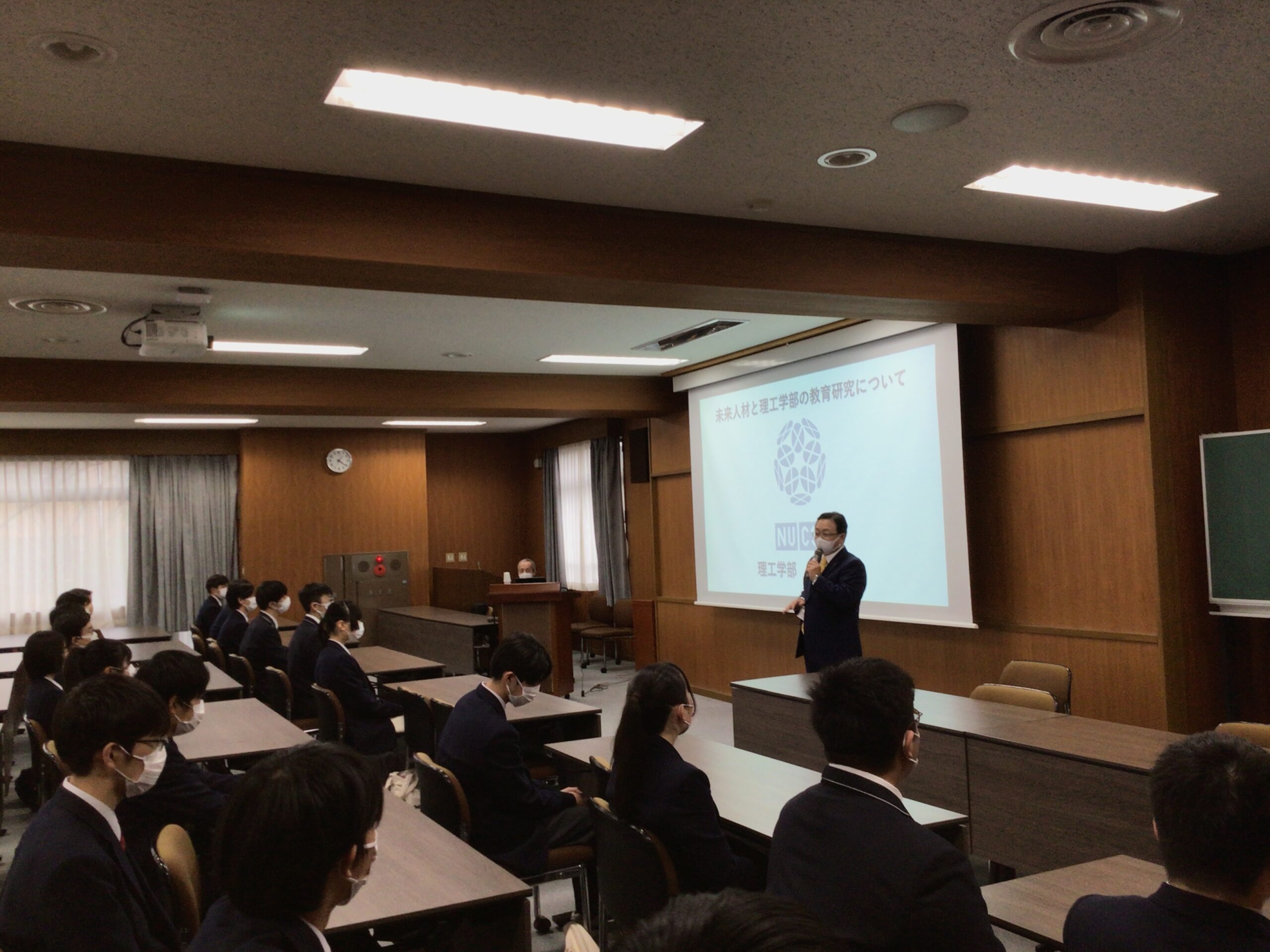 はじめに、校長先生から青木先生の紹介とともに、理工学部へ良い状態で入学できるようにこのオリエンテーションをしっかりと聞いてもらいたいというお話がありました。