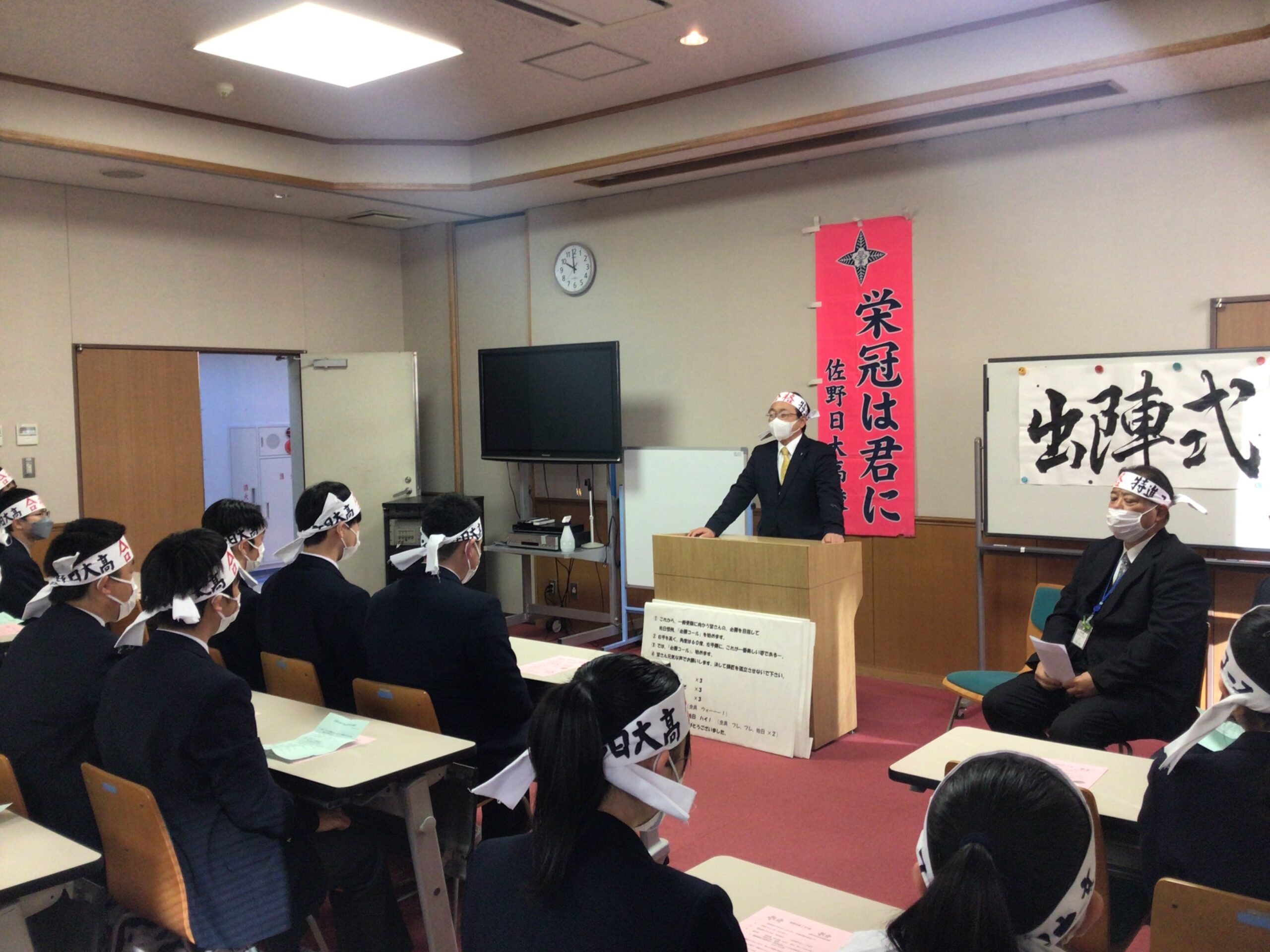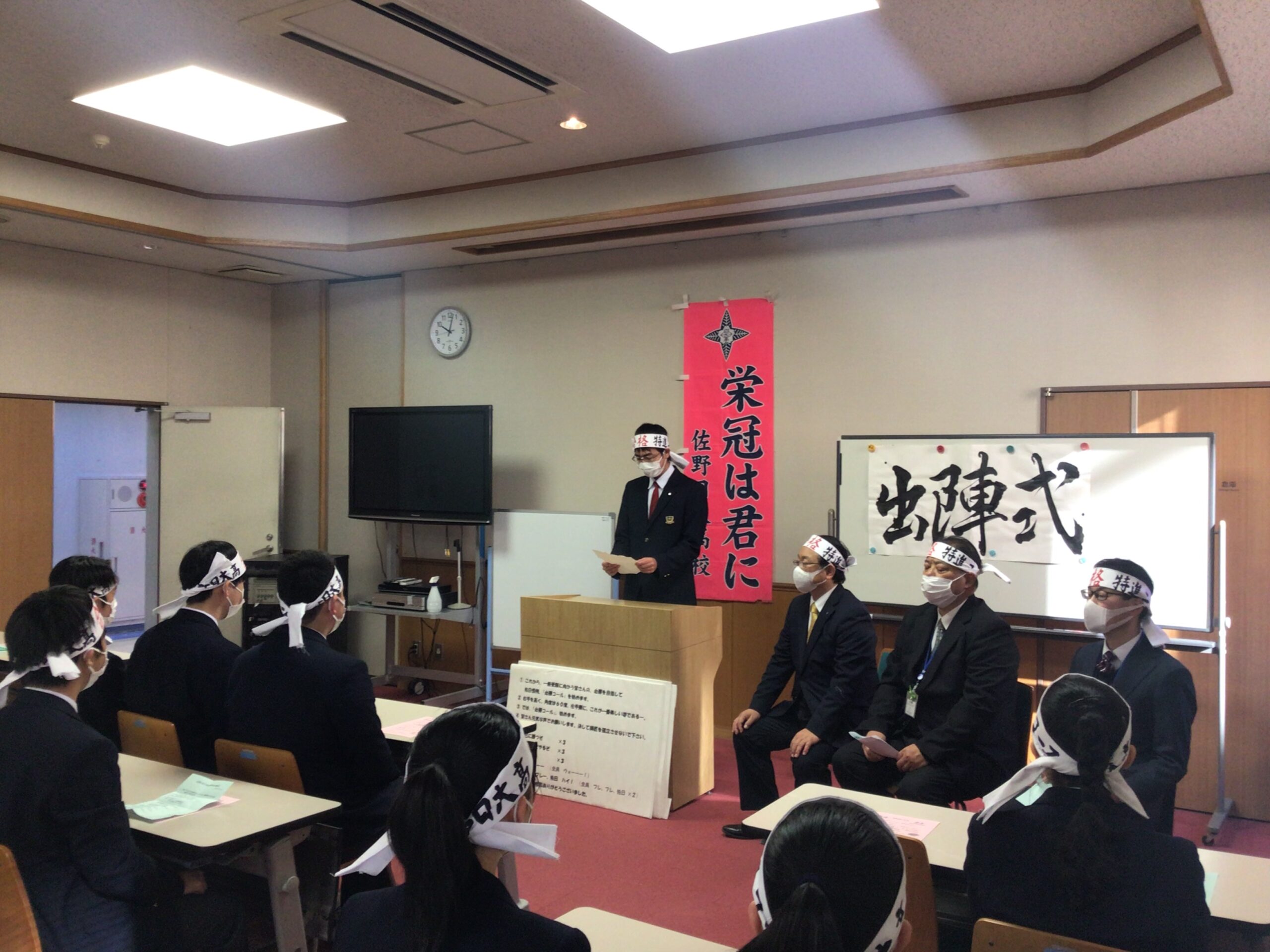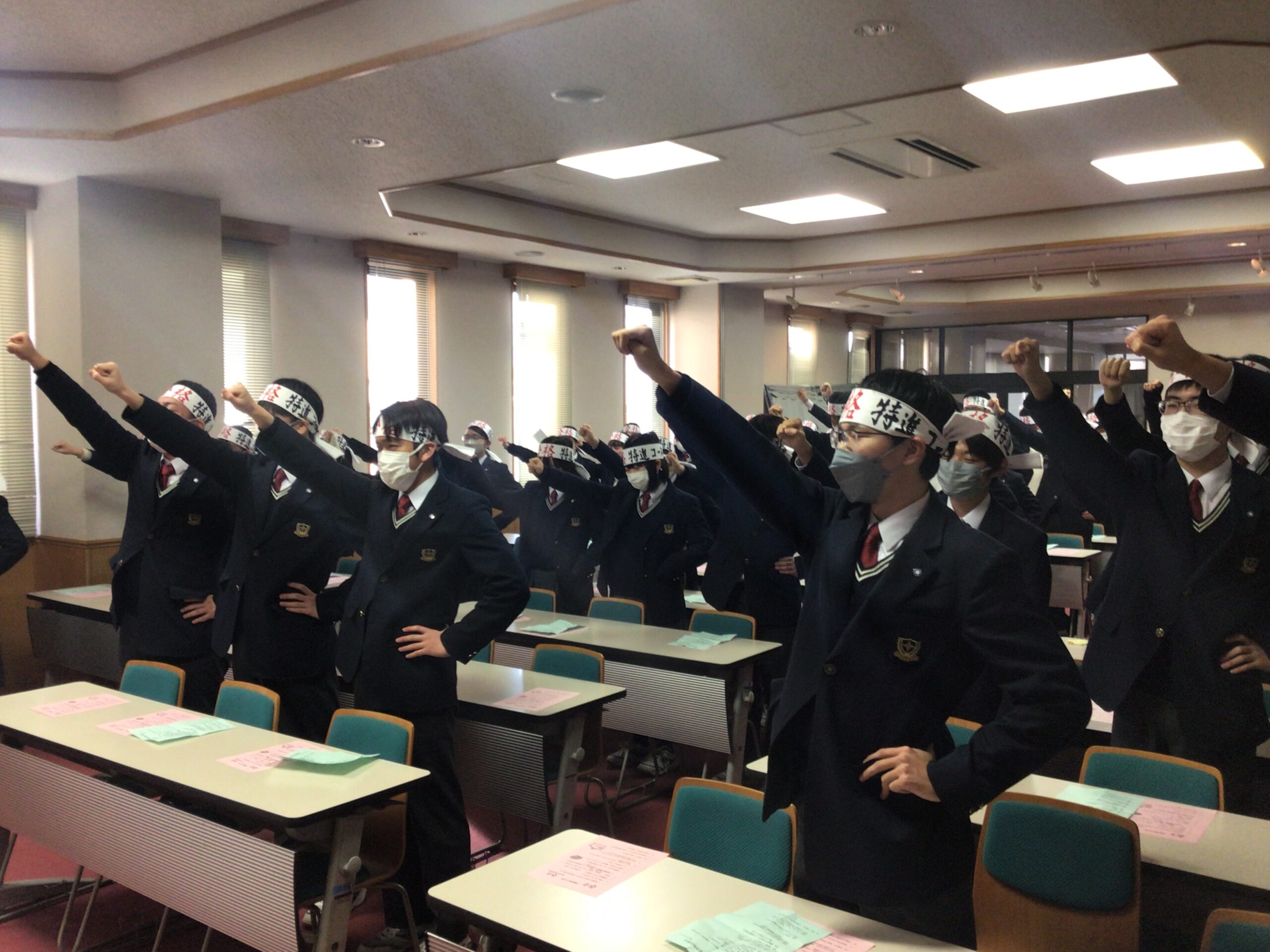 2023年01月10日(火曜日) 【特別進学コース】出陣式 今年度の大学入学共通テストも間近に控えた今日(10日)、 特進コース恒例の「出陣式」を行いました。 まずは校長先生からの激励の言葉です。 「これまでの成果を発揮するときがました。会場では緊張するかもしれないが、 これまでの努力を信じ、人事を尽くして天命を待ち、「疾風勁草」の気概を 持って取り組んでほしい。」というお話でした。 代表生徒の宣誓の言葉。3年1組田名網君。 最後に全員で「勝利の雄叫び」 国公立大学進学にむけて士気を高め合いました。