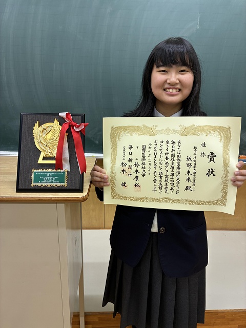 「第14回『共に生きる社会』めざして 高校生作文コンテスト」(国際医療福祉大学・毎日新聞社主催、文部科学省など後援)に2年1組αクラスの坂野未来(さかのみらい)さんが佳作で入賞し、11月30日(日)に国際医療福祉大学の東京赤坂キャンパスで行われた表彰式に出席しました。