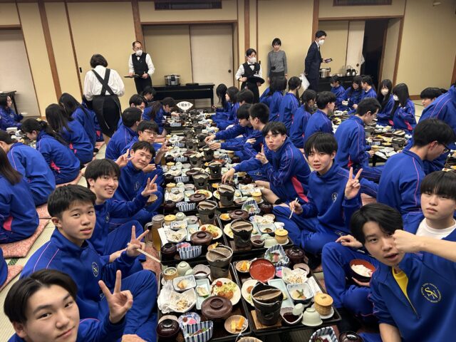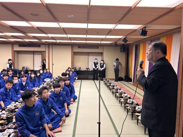 △今日はホテル千春楽に宿泊します。夕食時には片岡副校長先生からご挨拶をいただきました。明日は最終日です!最後まで気を抜かずしっかり楽しもう!