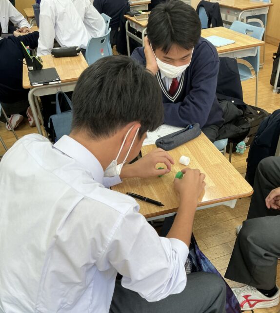 初回の今日は、動力車のイメージを膨らませながら、材質を検討し、必要となる素材をリストアップしました。教室にあったペットボトルキャップを使って、実際に手を動かしながら構想を練る生徒も…。