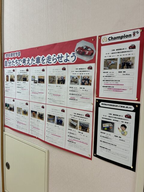 1学年の探究学習で取り組んだ「自分たちで考えた車を走らせよう ~ものづくり探究~」ですが、全クラスで記録会が行われ、各クラスの優秀作品(最長距離の記録を出した車)を製作したグループは作品に関するレポートを作りました。