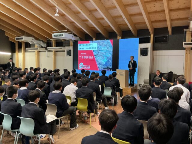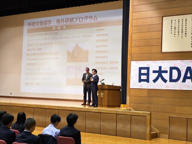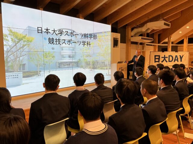 4月18日(土)、本校の高大連携教育の一環として日大DAYと称し、日本大学の各学部より学部長をはじめ講師の先生をお招きして学部説明会を実施しました。日大DAYは来週25日(土)にも予定しており、第1日目となる本日はプラザ40にて法学部・文理学部・経済学部、サニチコモンズにて工学部・危機管理学部・スポーツ科学部の説明会が行われました。生徒たちは興味のある学部を選択して、説明会に参加しました。また希望する保護者の皆様にもご参加いただきました。熱心に質問する生徒も見られ、大変有意義な会になりました。