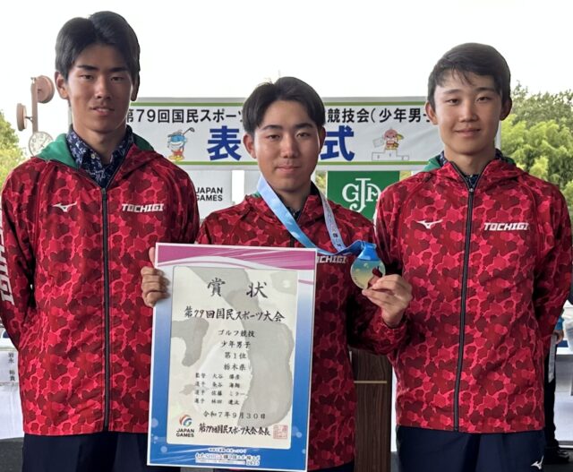 (写真左から 林田遼汰、粂谷海翔、佐藤ミラー) 第79回国民スポーツ大会(わたSHIGA輝く国スポ)ゴルフ競技少年男子の部が、令和7年9月29・30日の2日間、滋賀県のベアズパウジャパンカントリークラブにおいて開催され、栃木県代表として佐藤ミラー(2年)と林田遼汰(1年)、そして作新学院の粂谷海翔選手(3年)の3名で出場し、栃木県初となる団体優勝を飾ることができました。また、個人の部でも佐藤ミラーが4位入賞、林田遼汰が6位入賞を果たし、さらに1日目のベストスコア賞を佐藤ミラーが、2日目のベストスコア賞を林田遼汰が受賞いたしました。